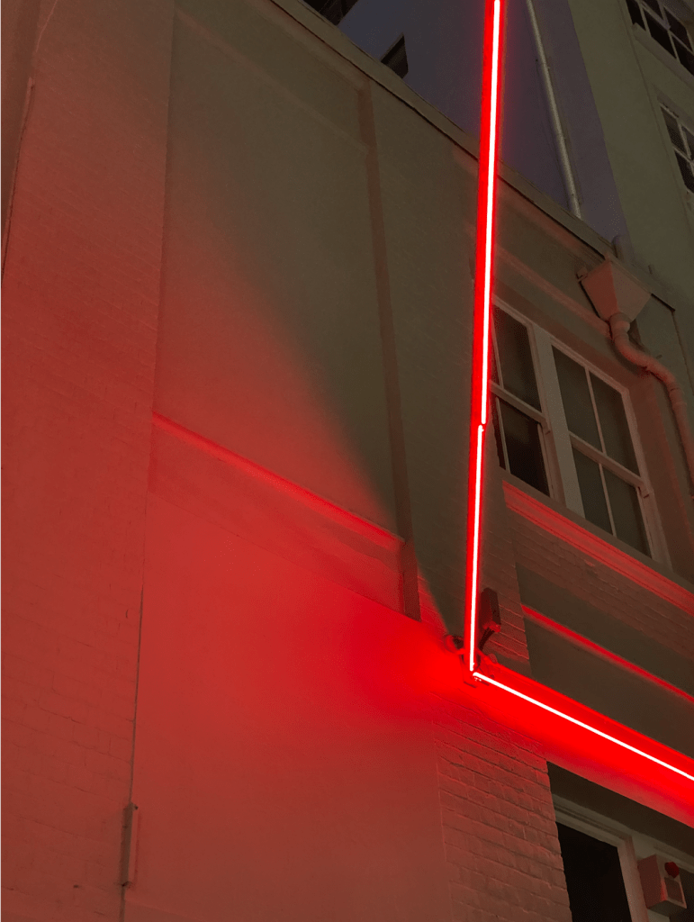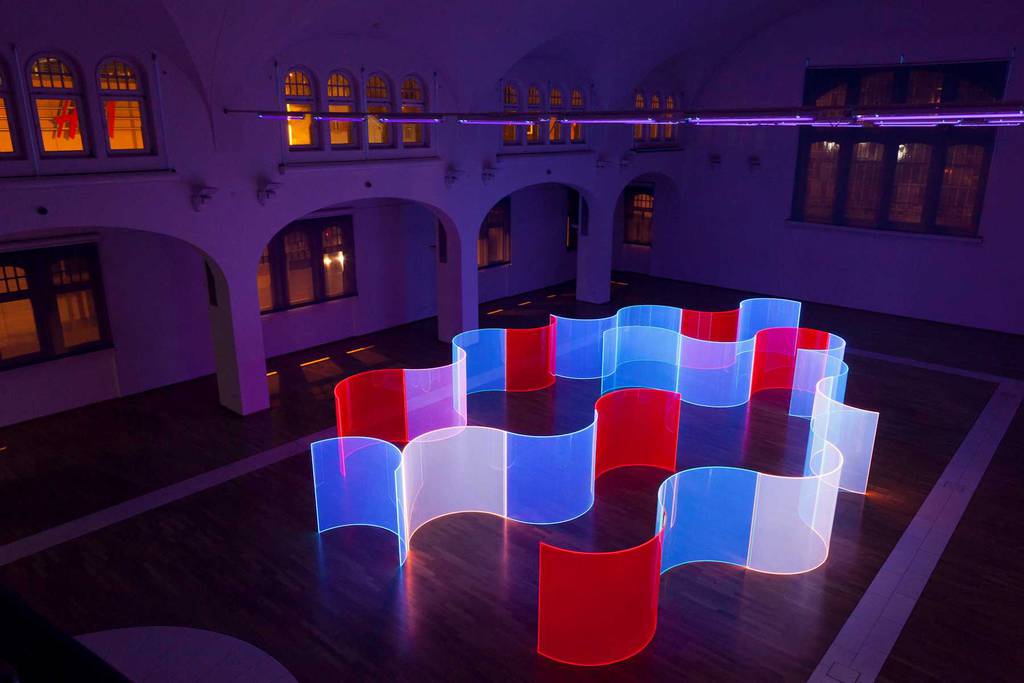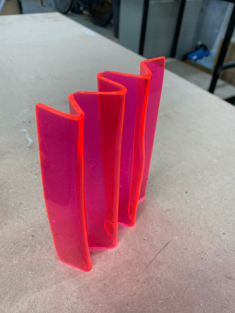 Pleating patterns applied to acrylic sheet to distort light and add colour to a space. The way the pink acrylic plays with colour when looking through it, creates purples, oranges and pinks. Very psychedelic. When the light travels through it the shadow takes on an awesome pink broken up by the pleating. A very cool shadow.