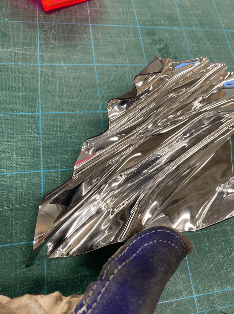 I pleated in a diagonal pattern with the mirror board and loved the result. The way the reflective surface catches the light in the folds is incredibly eye catching. The reflective nature also helps to create the illusion of it being a soft material and distorts the reflection. I like the idea that looking into these objects, you get to see a different, warped reality that lives within the reflection and the shadow of these objects.