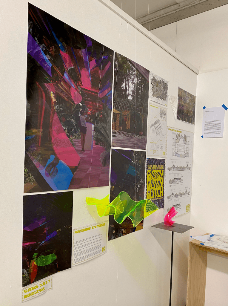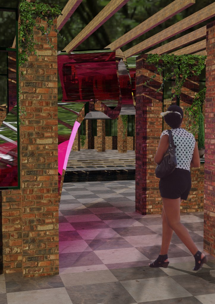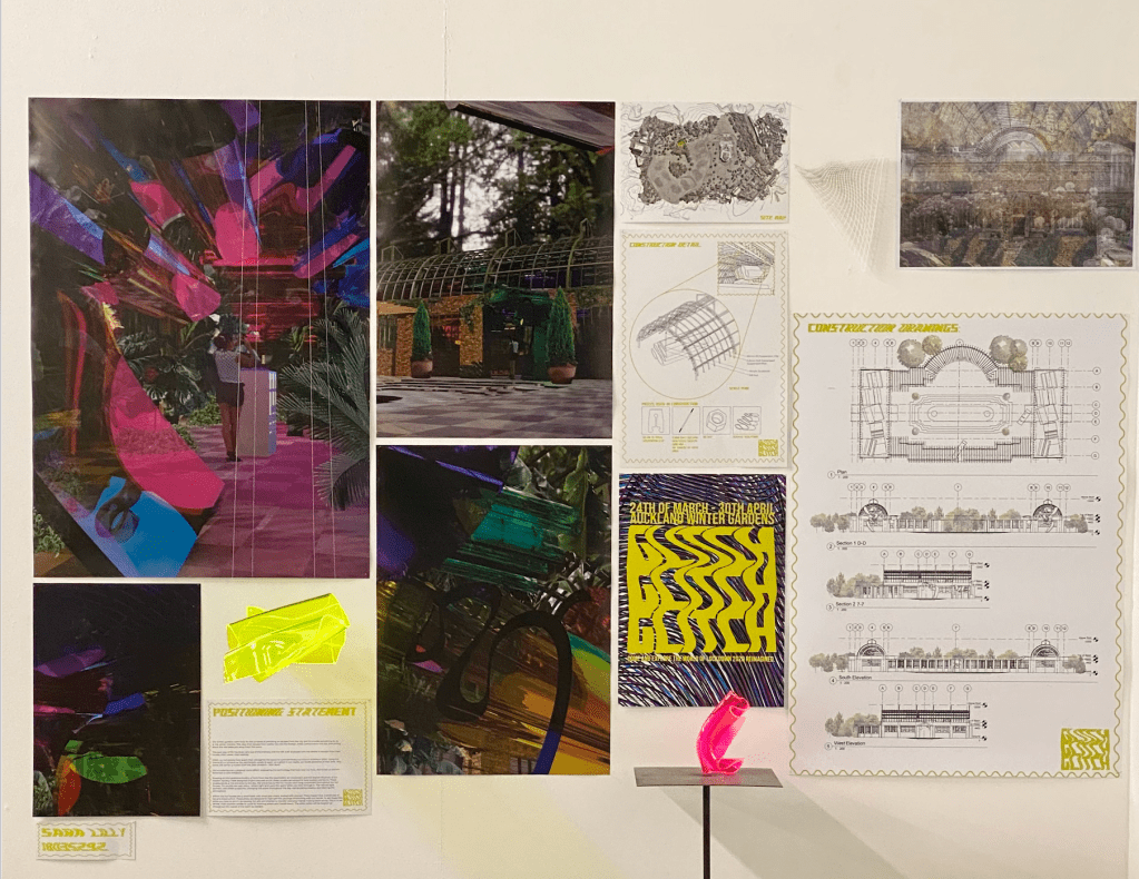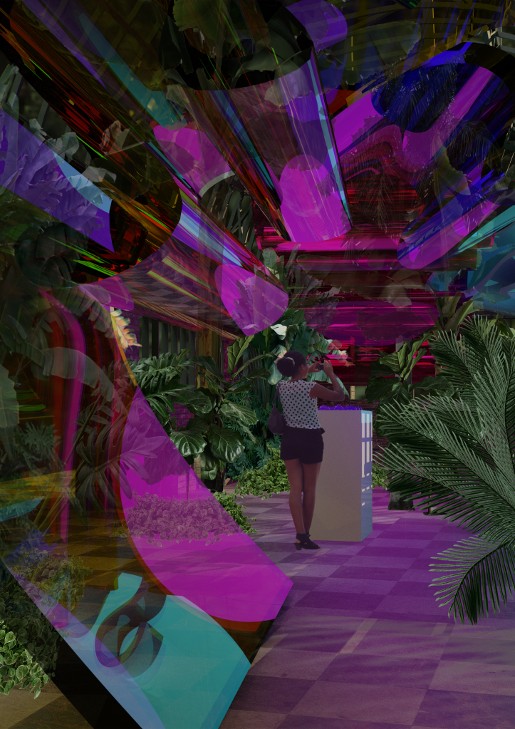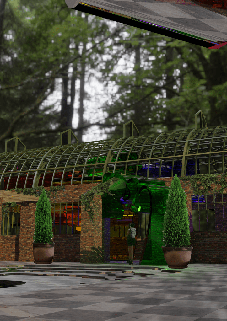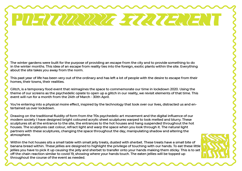 I’ve simplified the amount of acrylic pieces in the space to create more suspense and a climax when walking into the hot house. I would have 1 acrylic piece at the entrance to the winter gardens then one at each entrance into the hot houses and then inside the hot houses have 6 large pieces suspended from the ceiling. I’ll have little jelly domes with banana bread inside.