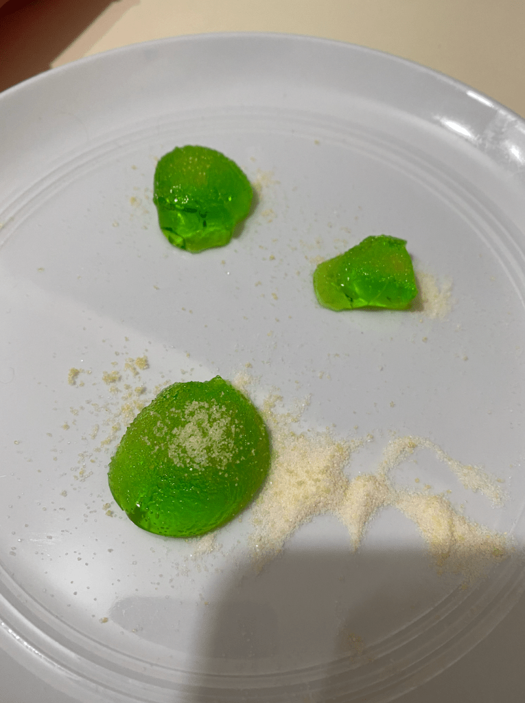 The texture of the banana bread jellies with the sherbet on top created a really interesting sensation in the mouth. The texture is somewhat off putting but the taste is sweet as you taste the granules of sherbet.