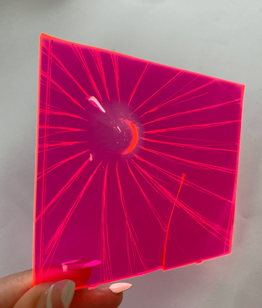 Acrylic screen etched to create a focal point and then heating and extruding the focal point to catch the light and warp colour.