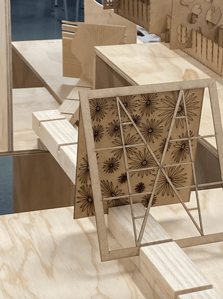 I’ve used the laser cutter on different materials in my minor paper, I like how versatile it can be when applied to different materials and at different depths. I’m interested in using materials like acrylic as it can be melted, engraved, there are lots of different colours and varying levels of transparency. I also like playing with reflective surfaces and the illusion effect it can have in a space.