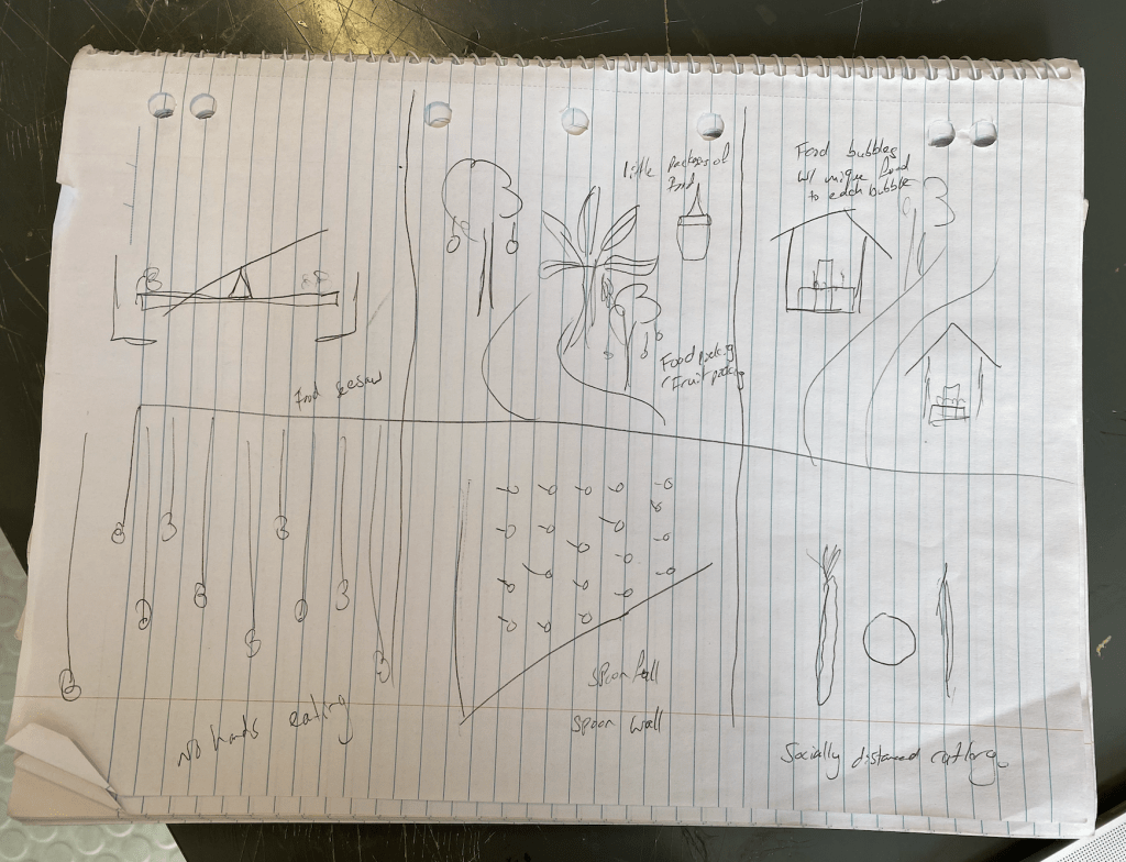 I will set up food within the space that explores themes like social distancing, the nature of eating and what is a normal way of eating. I personally love to eat in a grazing manner and would like to explore the use of hands when engaging with food and the controversy that comes with that in this current climate. Setting up food in a way that resembles fruit picking or gathering. Alternatively it would be interesting to explore eating with a distance element and explore how you can create an intimate meal between two people when there is physical distance between them.