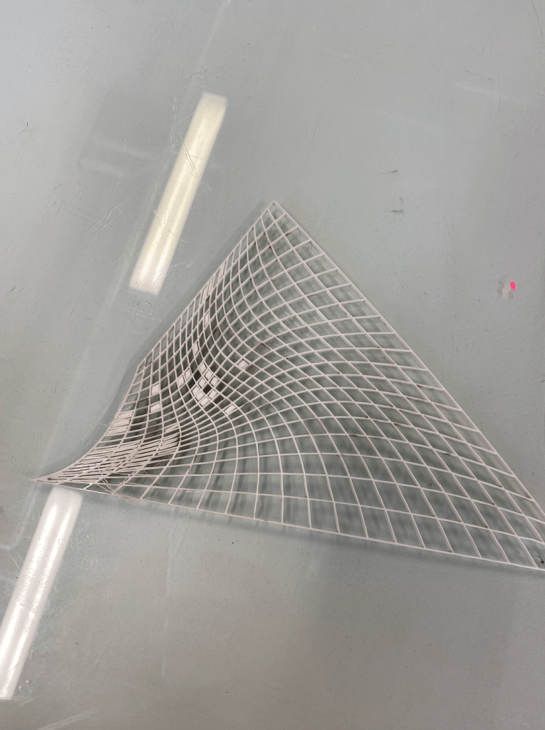 Process used – when creating my grid I played around with warping and twisting the grid lines in illustrator creating the illusion of a twisted piece of material. I then laser cut the warped grid into some white acrylic. In the light, the shadows create a really cool pattern on the surrounding surfaces. The warp makes the material look folded and really cool.