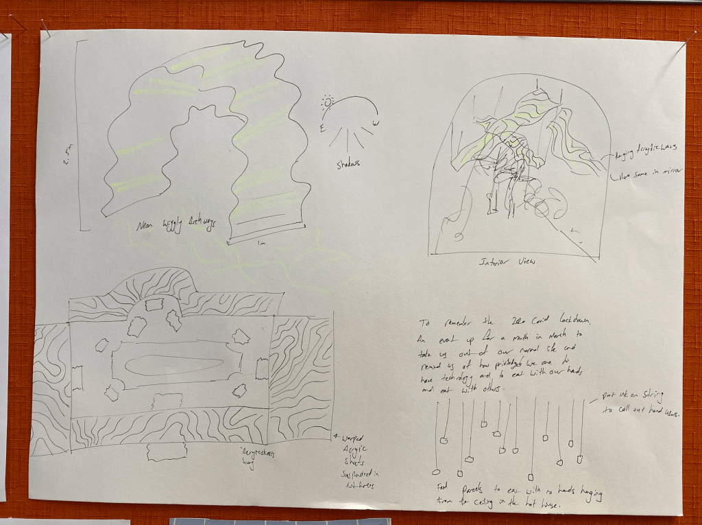 I will set up food within the hot house spaces that highlights the privilege of touch with our hands. Small bites of food will hang from the ceiling for you to consume without the use of your hands. The string that suspends the food will be coated in edible dye that will transfer to your hands if touches. This can set off the chain reaction similar to covid 19 showing where your hands touch.