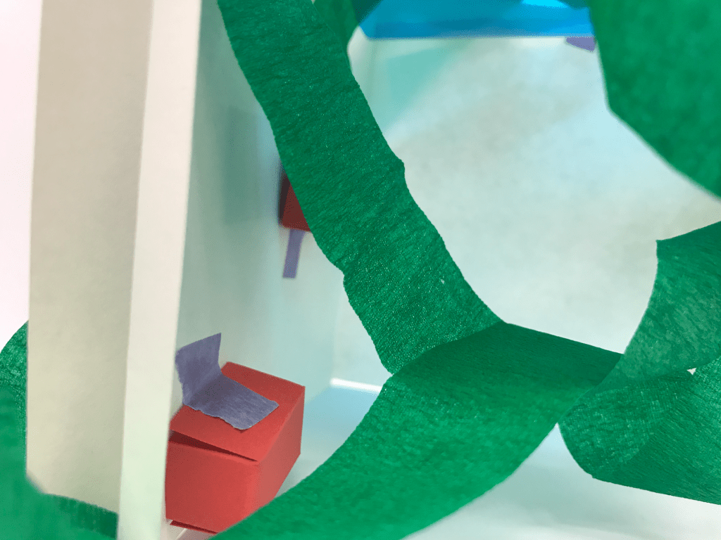 Model 2 Analysis: In focusing on texture I drew on the contrasting textures of the matte aspects of nature and the glossy shiny aspects of glass from the buildings. In looking at my model it almost tells a story of nature trying to reclaim the urban environment as the matte green wraps itself around the glossy blue structure. The shadows it creates is a broken up blue hue where the light can cut through and dark where the green intersects the path of light emphasising this idea of nature taking over.